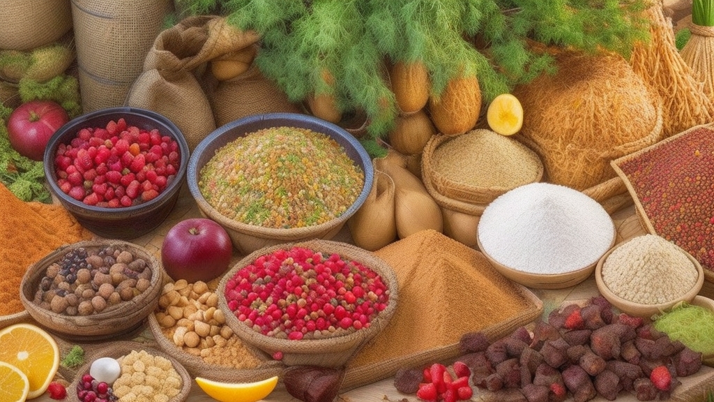 Eine vielfältige Auswahl an Kräutern, Samen, Gewürzen und dehydriertes Gemüse, das jeweils so beschafft wird, dass es verkörpert die reiche Tradition Ägyptens.